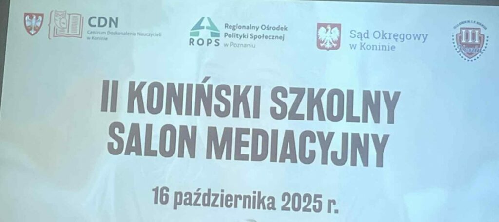 16 października 2025 roku w murach III Liceum Ogólnokształcącego im. Cypriana Kamila Norwida w Koninie odbył się II Koniński Szkolny Salon Mediacyjny. W programie wydarzenia znalazł się inspirujący wykład prof. Anny Brzezińskiej z Uniwersytetu im. Adama Mickiewicza w Poznaniu pt. „Relacje a dobrostan dzieci i młodzieży”, a także warsztaty skierowane do uczniów, nauczycieli, pedagogów, psychologów oraz mediatorów szkolnych. Uczniowie naszej szkoły: Marcelina Skowronek, Maja Nowak, Karolina Dobroń, Lena Wyrostek, Maja Janiak, Aleksandra Głoszkowska, wraz z paniami Beatą Skibiszewską i Patrycją Szczepankiewicz, aktywnie uczestniczyli w warsztatach poświęconych rozpoznawaniu dobrostanu ucznia. Spotkanie było okazją do refleksji nad znaczeniem relacji w budowaniu pozytywnego klimatu szkoły oraz do pogłębienia umiejętności mediacyjnych. Podczas wydarzenia przypomniano, że mediacja to sztuka rozmowy i budowania porozumienia tam, gdzie pojawia się konflikt — umiejętność szczególnie cenna w codziennym życiu szkolnym. Z racji tego, że 16 października obchodzimy Międzynarodowy Dzień Mediacji, w naszej szkole odbył się również konkurs pt. „Kilka słówek o mediacji”. Uczniowie przygotowali plakaty z twórczymi hasłami, które miały na celu uświadomić, jak wiele może zmienić zwykła rozmowa i jak skutecznie może pomóc w rozwiązywaniu sporów.